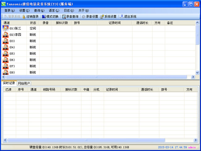 8、錄音查詢界面:用戶可以在這個完成,錄音文件的查詢,播放,統計通話數量,通話時長,備注,導出等功能,也是錄音系統最常用的一個功能模塊。