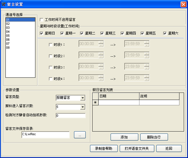 9、留言設置界面:各通道可自由播放不同的語音文件,可以分為按假期播放;按星期播放;按時間段播放;按通道播放等方式進行播放。