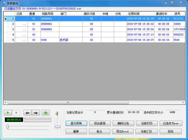 通過客戶端軟件在網絡客戶端對錄音設備進行錄音監聽。 10、錄音查聽 可按來電號碼或撥出的電話號碼、中繼、分機、通話時間、時長,自動判斷撥出撥入方向、市話還是長途條件進行查聽;支持模糊檢索;對錄音、備份資料進行快速、簡潔的回放查聽。 11、遠程管理 系統可以設置自動向遠程服務器備份,每個分點電話的錄音系統實時通過FTP向指定的服務器進行自動備份,在遠程服務器上可以直接進行管理,而不需到每個分點當地端上查聽,有利于節省管理成本,提高效率。 12、自動備份 對于有些重要的錄音數據,可以通過此功能對其進行自動備份,以防止系統在遇到不可預料的故障時,數據可以恢復。系統具有自動同步雙備份功能,也可通過系統手工備份到您想要保存的目錄或刻錄光盤永久保存。 13、資料導出 錄音數據如有需要則可以使用此功能導出WAV格式,可在任意計算機上使用自帶的播放器即可播放。 14、權限管理 系統具有多級用戶管理功能,不同權限的用戶只能操作其相應的功能,例如可以設定某操作員只能查詢、統計錄音,而不能刪除錄音數據等。 15、多種錄音方式 具有壓控、鍵控、聲控等多種錄音方式選擇,每條線路均可設置不同的錄音方式或不錄音。 16、日志管理 系統具有完整的操作日志,可以記錄對系統的所有操作。 17、循環空間 可以設置多達4個盤(可以是硬盤、分區或網絡映射盤)自動循環錄音空間,當系統的硬盤空間將滿時,系統將自動清除最先錄音的文件,確保系統常年不間斷運行。