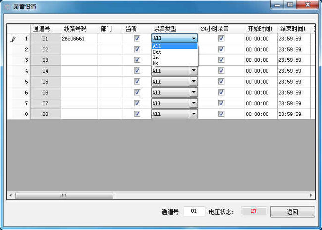 技術參數: ●通道數:16 ●系統平臺:WIN 7 ●內存:2GB ●硬盤:1000GB(1GB可以約35個小時) ●客戶端數量:1個 ●連接方式:并聯 ●錄音啟動方式:壓控、鍵控、聲控 ●最大消耗功率: ≤30W ●工作溫度: 5℃-40℃ ●信噪比: 60dB ●濕度: 5%-85% ●頻率響應: 300-3400Hz(±3dB) ●數據速率: 16 Kbps、32Kbps、64kbps/1s ●接口方式: RJ11 ●錄放音失真度: ≤2% ●主叫號碼: FSK、DTMF ●FSK調制方式: 邏輯 0 : 2200Hz±1%,邏輯 1 : 1200Hz±1% ●呼叫監測: 信號音、語音。 ●DTMF碼: 0~9、*、#、A、B、C、D ●語音文件: WAV ●壓控模式判斷電壓標準40-120V(振鈴) 18-48V(空閑) 5-17V(摘機) 附:產品部分圖片: 1、硬件后視圖 2、主工作界面,可以直觀看到線路的空閑,通話時長等狀態。 3、錄音模式與分時間段錄音設置界面 4、錄音模式啟動設置方式界面,如“Key”為鍵控方式,即選擇性錄音,重要通話時按“*”鍵才錄,不按鍵則不錄音。 4、FTP設置界面,總部可以按網點進行查聽,統計各分公司的通話記錄。 5、客戶信息彈屏功能界面,客戶來電后可以直接在計算機看到客戶的電話號碼,地址,姓名等詳細信息。 6、來電時,在屏幕右下角彈出的小對話框。 7、客戶資料界面:在這里可以完成對客戶資料的編輯,添加,刪除,導出,導入等操作,也可以把原有客戶資料按指定格式導入客戶資料庫。 8、錄音查詢界面:用戶可以在這個完成,錄音文件的查詢,播放,統計通話數量,通話時長,備注,導出等功能,也是錄音系統最常用的一個功能模塊。 9、“綜合查詢”界面:可以按姓名,線路號碼,部門等指定條件來查找,統計錄音記錄。 10、打印匯總界面,可按月/天統計話務人員的呼入次數,呼出次數,通話時長等。 11、客戶查聽端界面,客戶端可以在同一局域網內自動獲得主機的IP地址然后登錄,從而實現查聽,播放,統計錄音數據等功能。 12、客戶端工作界面 13、WEB網頁登錄訪問登錄界面(支持跨平臺,跨系統進行查詢,統計,播放,導出錄音文件等操作) 14、WEB網頁工作界面