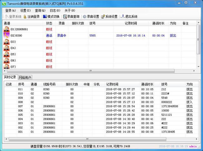 18、線路管理 對線路進行電話號碼及使用者姓名注釋,管理方便一目了然。也可設置24小時錄音或分時間段錄音,最大可設置4個時間段。 19、特號設置 可設置特殊電話號碼,系統將自動作不錄音處理。 20、通電自啟 電源停電再次來電后,無需操作任何開關,系統會自動啟動后并進入錄音監控狀態,保證你不會因為忘記不及時開機而導致錄音丟失。 21、斷線告警 當通道線路斷線后,系統自動發郵件告警通知管理人員,讓管理人員實時知道線路狀態,保證錄音有效正常進行。 22、快速查詢 連接專業的MSSQL數據庫使用,縮短在數據量大的情況下,等待結果的時間,提供應用效率。 23、分組管理 在服務端可以根據公司不同部門進行分組管理,每個部門經理只能查詢自己部門的人員通話記錄。 24、跨時間段查詢 傳統的電話錄音系統一般只能按照每月范圍內進行查詢,例如:需要查詢2014年5月5日至6月30日的數據,傳統的電話錄音系統則無法實現,只能按照5月份,6月份2份結果再進行統計,本設備則可以實現跨時間段查詢,可以查詢任意時段。 25、大容量存儲 出廠自帶1000G硬盤,最少可以保存33250個小時的通話記錄.按照16個通道來計算,平均每天每個通道通話2個小時的電話量計算,可以保存約1039天錄音數據。系統硬盤如果錄滿了會自動覆蓋最早時期的錄音文件。 溫馨提示:出廠時默認是1000GB的硬盤,用戶可以選配2000GB的硬盤。 26、智能客戶端 為每一個系統配有智能客戶端軟件,在需要監聽的計算機安裝后,即可實現實時監聽,查詢,統計,連線狀態等功能。(此版本只支持同時1個智能客戶端查詢,如果需要多個智能客戶端請選購我司另一款T3系列的嵌入式產品。) 27、WEB查詢端 WEB查詢端跨平臺查詢。比如:蘋果電腦、手機、平板上進行查詢。
