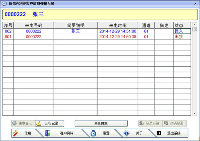 6、客戶信息彈屏功能界面,客戶來電后可以直接在計算機看到客戶的電話號碼,地址,姓名等詳細信息。