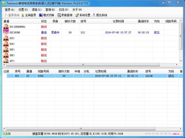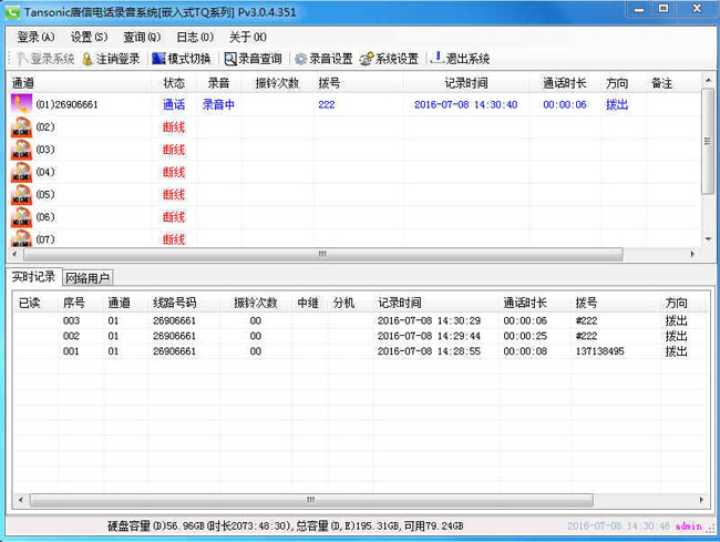 當被監聽設備使用時,系統便自動進行錄音,系統把語音信號以數字化語音格式寫入硬盤。同時系統記錄其通話日期、時間和當前通話時間等信息。如果該被監聽設備為電話線路,還可以記錄打出電話的外線號碼或打入電話的來電號碼,掛機時系統便會自動停止錄音。