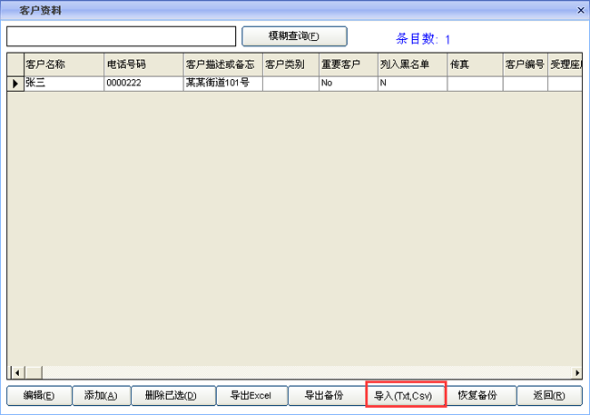 8、客戶資料界面:在這里可以完成對客戶資料的編輯,添加,刪除,導出,導入等操作,也可以把原有客戶資料按指定格式導入客戶資料庫。