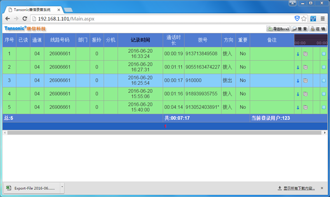 17、WEB方式統計界面,可以按通道,通話時間,號碼等條件查找,統計錄音文件,并且可以將結果導出Excel。