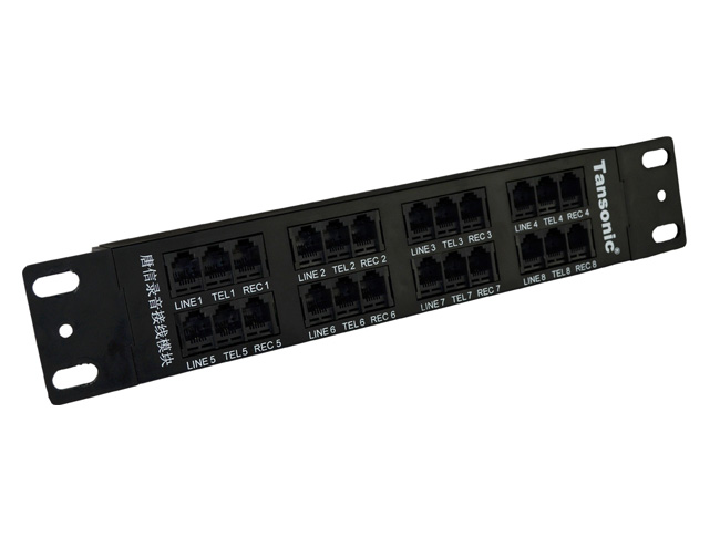 TXJ8唐信錄音接線模塊是唐信科技根據(jù)電話錄音系統(tǒng)的接線需求,結合實際使用環(huán)境所設計出來的一款接線方便,整齊、美觀的可拼裝型的專業(yè)接線產品。具有24個6P2C水晶座接口,分為2行4列共8組,每組由3個6P2C的水晶座組成,每條可為8路以內的電話錄音系統(tǒng)提供水晶座方式連接。該產品可以直接擺放在桌面或電腦機箱上使用,也可以掛在墻上或使用2條拼裝成1條16路直接接入標準機柜里使用。