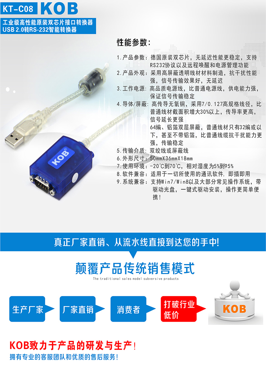 KOB品牌KT-C08工業級芯片USB轉RS232串口